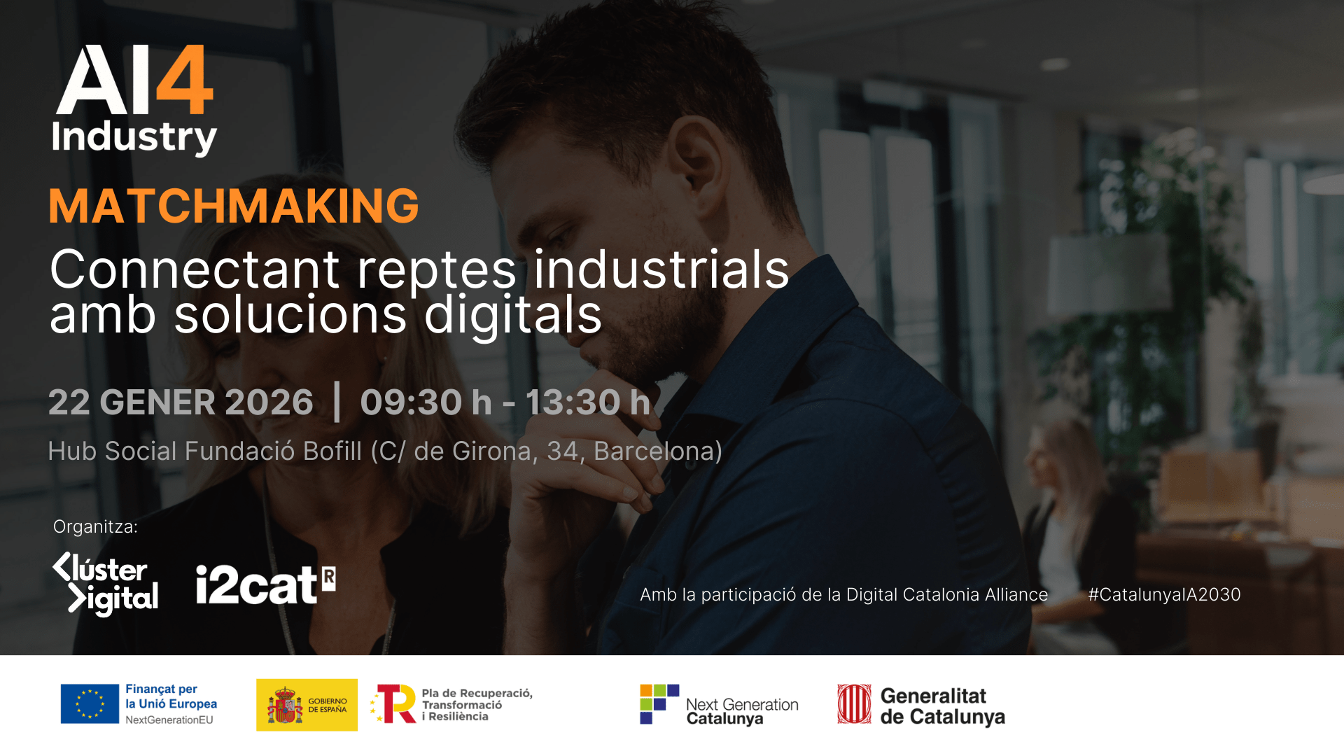 El Centre de Recerca i2CAT i el Clúster Digital de Catalunya impulsen la jornada Matchmaking Ai4Industry el divendres 23 de gener de 2026 de 9.30 a 13.30 h al Hub Social – Fundació Bofill (C. Girona, 34, Barcelona).