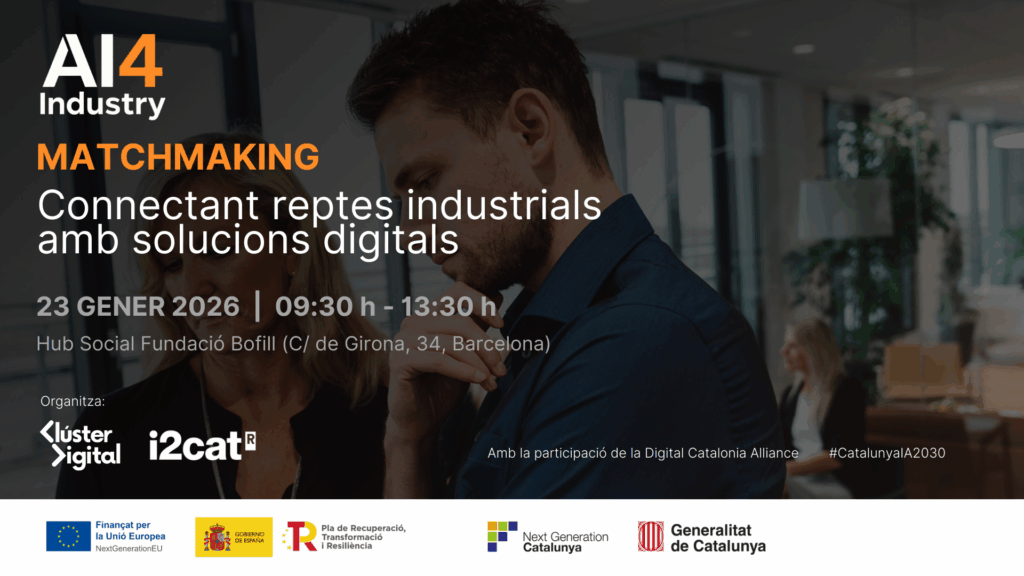 El Centre de Recerca i2CAT i el Clúster Digital de Catalunya impulsen la jornada Matchmaking Ai4Industry el divendres 23 de gener de 2026 de 9.30 a 13.30 h al Hub…